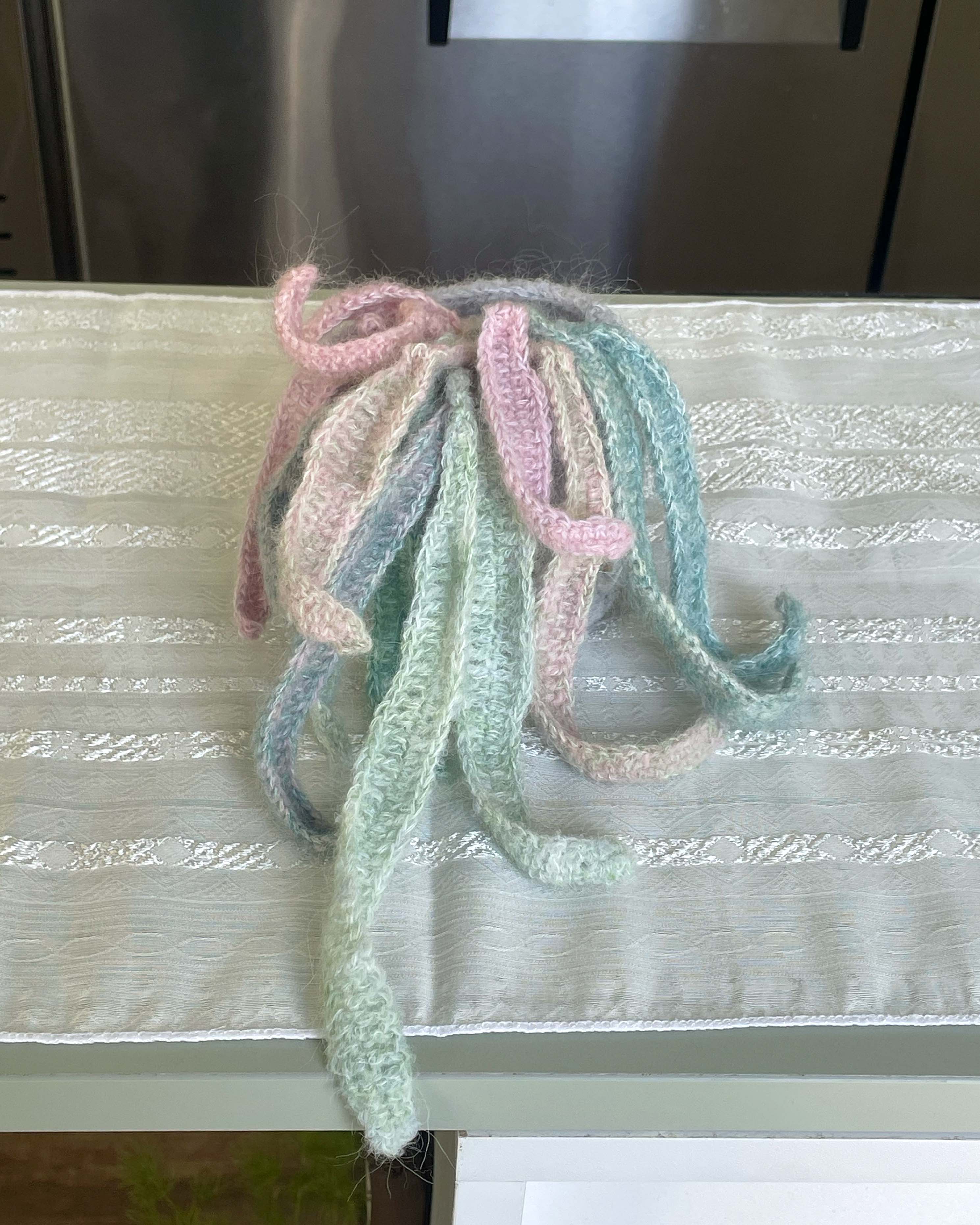 연두, 살구, 분홍, 초록의 실들을 엮어 만든